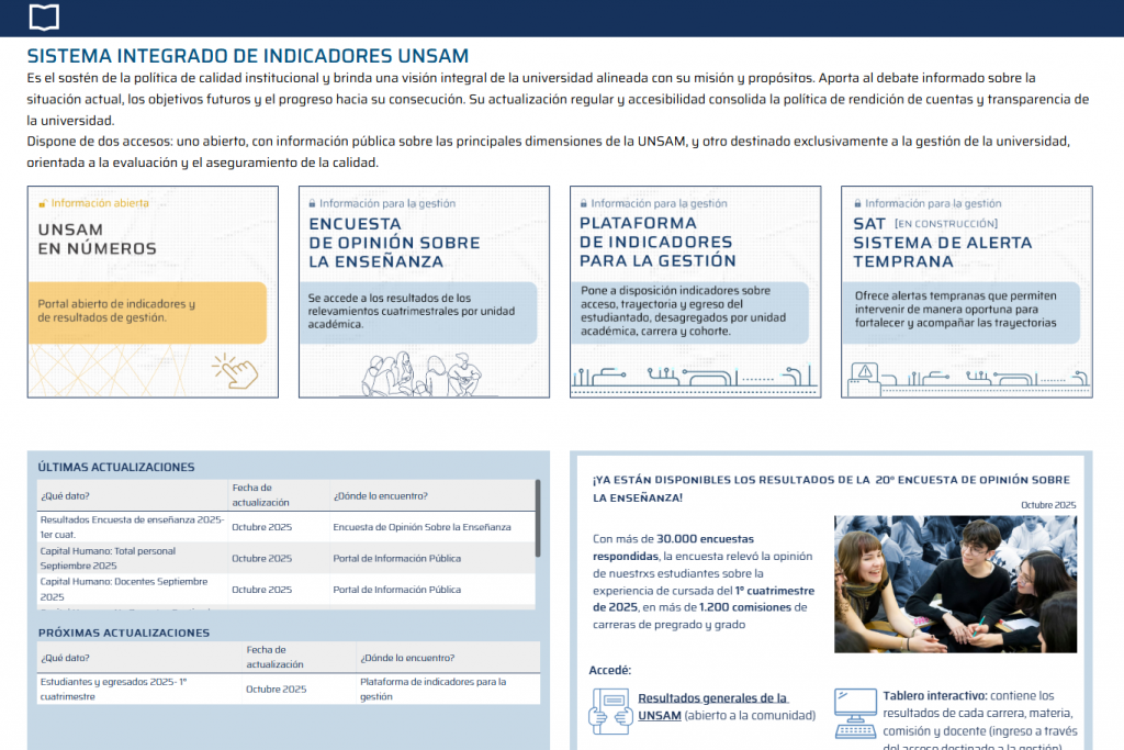 El acceso al tablero se realiza desde la nueva web del Sistema Integrado de Indicadores de la UNSAM, en la sección “Encuestas de Opinión Sobre la Enseñanza”. A la misma se puede acceder desde la web de la UNSAM, sección “Institucional”.